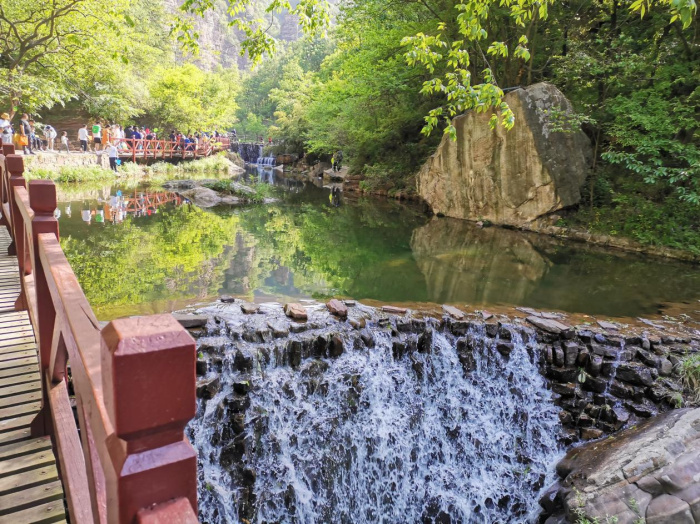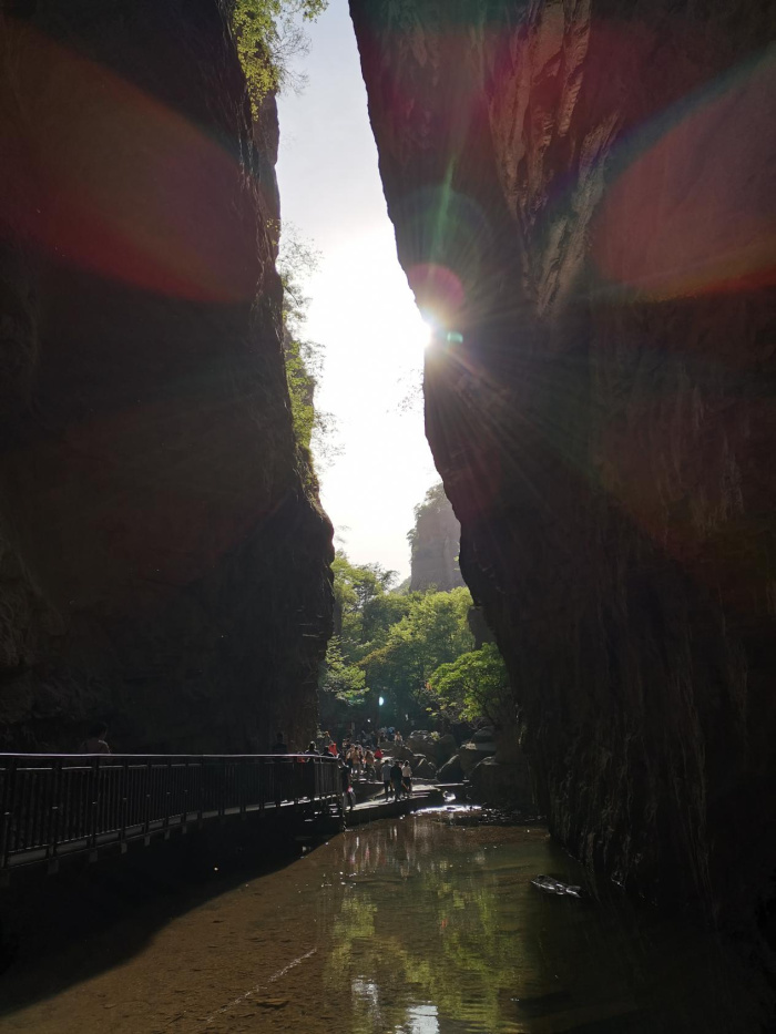 進(jìn)入景區(qū),眼前美麗的瀑布從高高的山上奔流而下,走在幽幽的峽谷內(nèi)就如同走在平坦的巷子里。峽谷里充滿了流水潺潺的聲音,溪水清澈見(jiàn)底,各種怪石橫臥在峽谷內(nèi),兩岸紅巖絕壁,瀑布飛濺。大家一邊說(shuō)笑一邊欣賞自然美景,一會(huì)兒穿過(guò)美麗的蘆葦蕩,一會(huì)兒探尋神密的海盜船,一會(huì)兒又在宏偉壯觀的天碑前拍照留念。